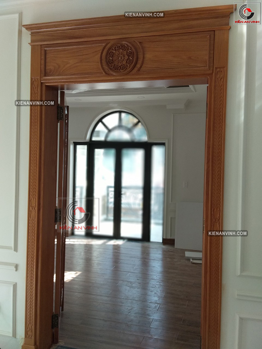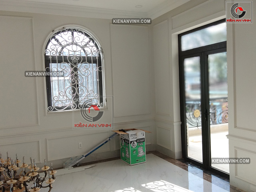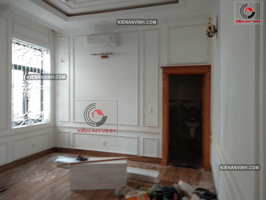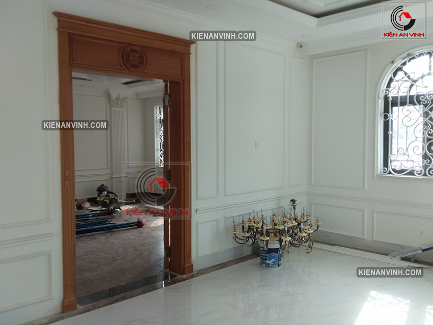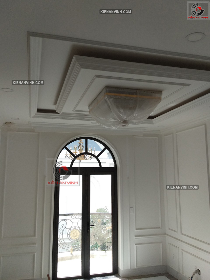 Các chi tiết kiến trúc nổi bật như ô cửa chính và cửa sổ được thiết kế tạo hình vòm cong mềm mại, mang phong cách đặc trưng của ngôn ngữ tân cổ điển. Những đường cong ấy không chỉ tăng thêm phần duyên dáng mà còn góp phần tạo thẩm mỹ cân đối và hài hòa, giúp ngôi biệt thự trở nên trang nhã nhưng không kém phần hiện đại. Các chi tiết phào chỉ chuẩn bị cho giai đoạn hoàn thiện cũng được thi công cẩn thận để đảm bảo độ nét và chính xác.