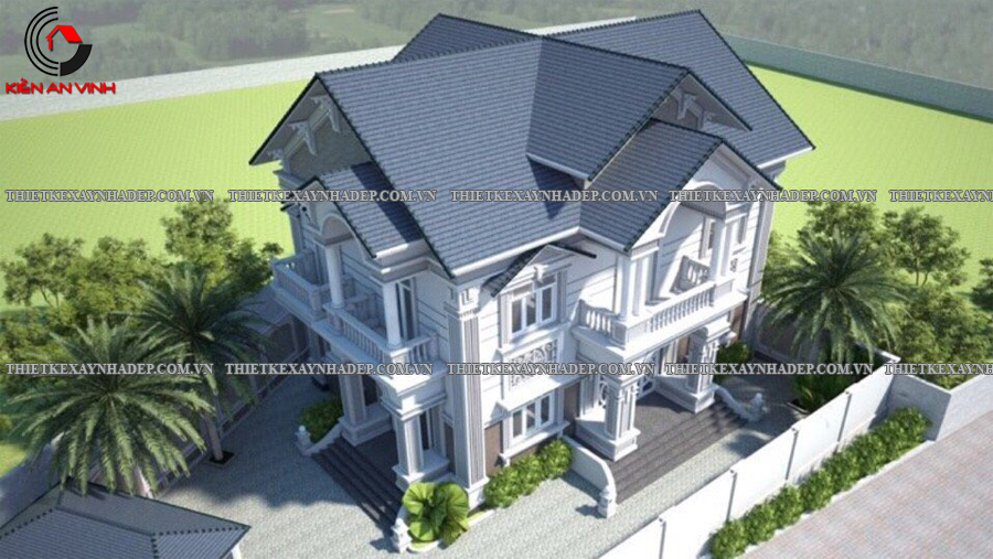 Thi công biệt thự tân cổ điển 2 tầng 2 mặt tiền mái thái 9x18m có sân vườn và 4 phòng ngủ ở bến lức