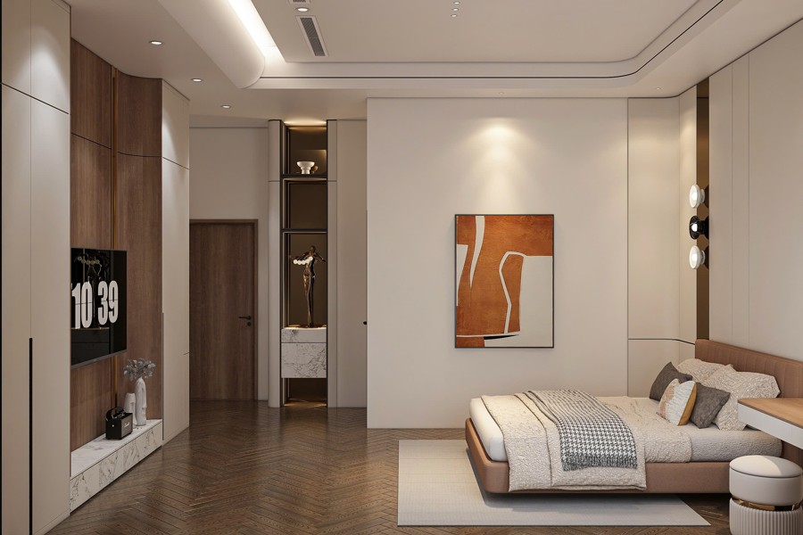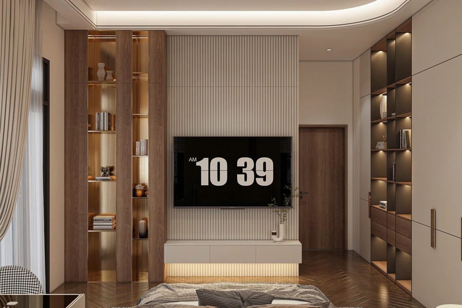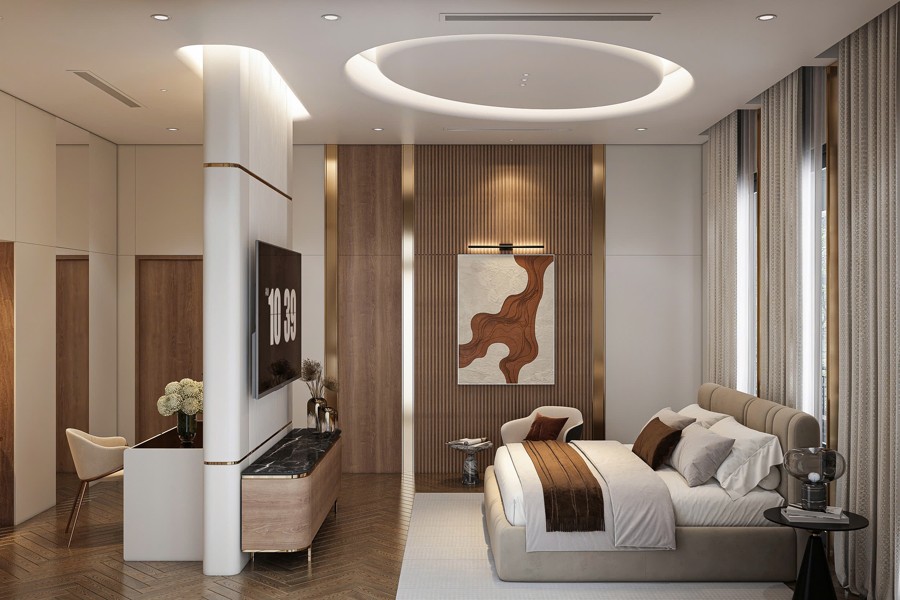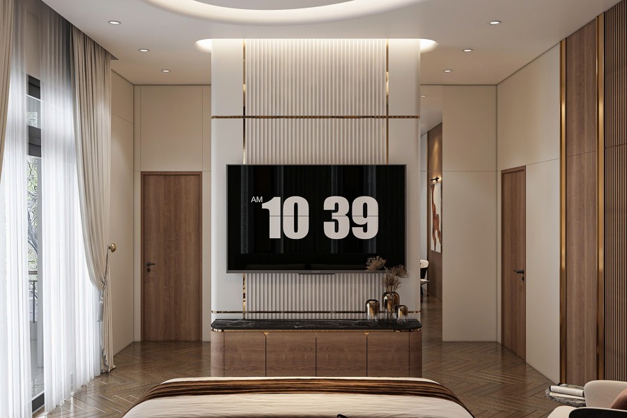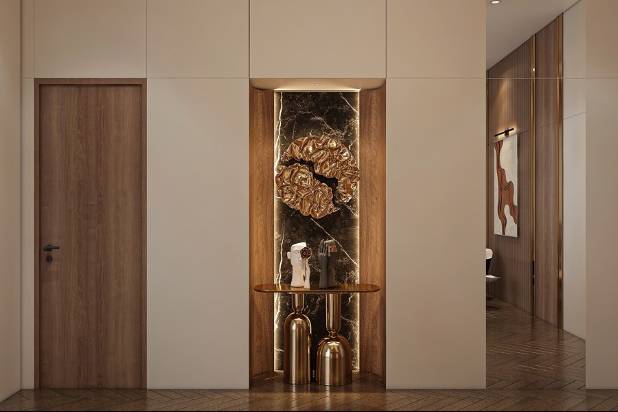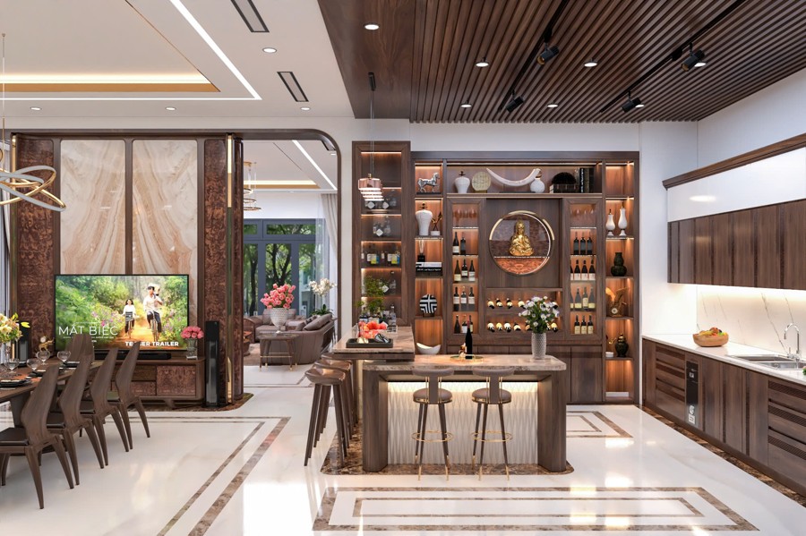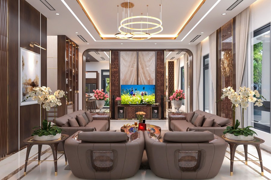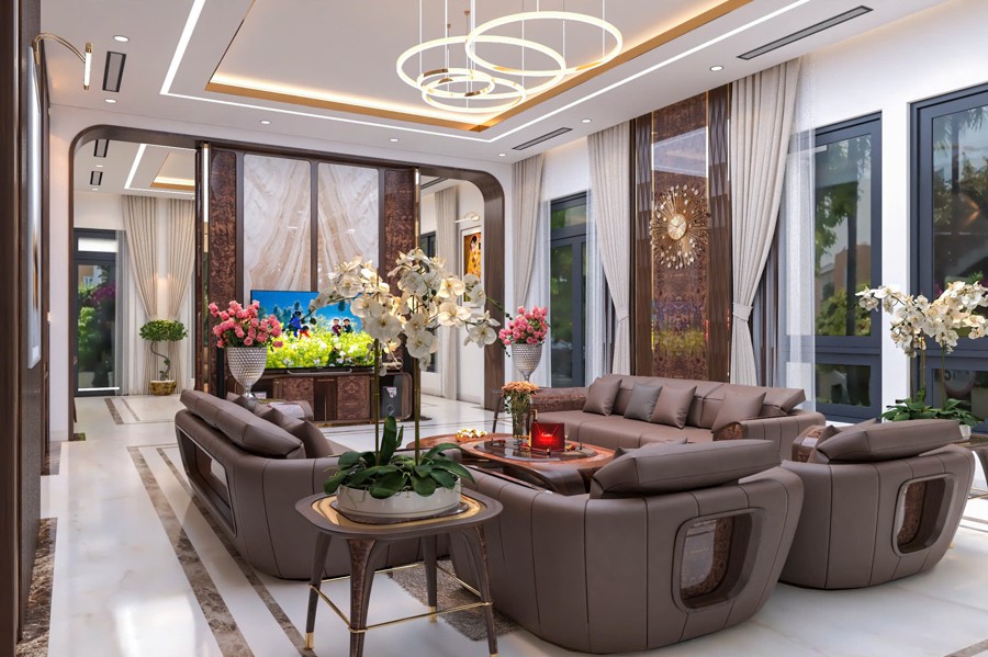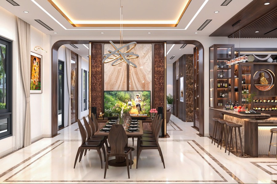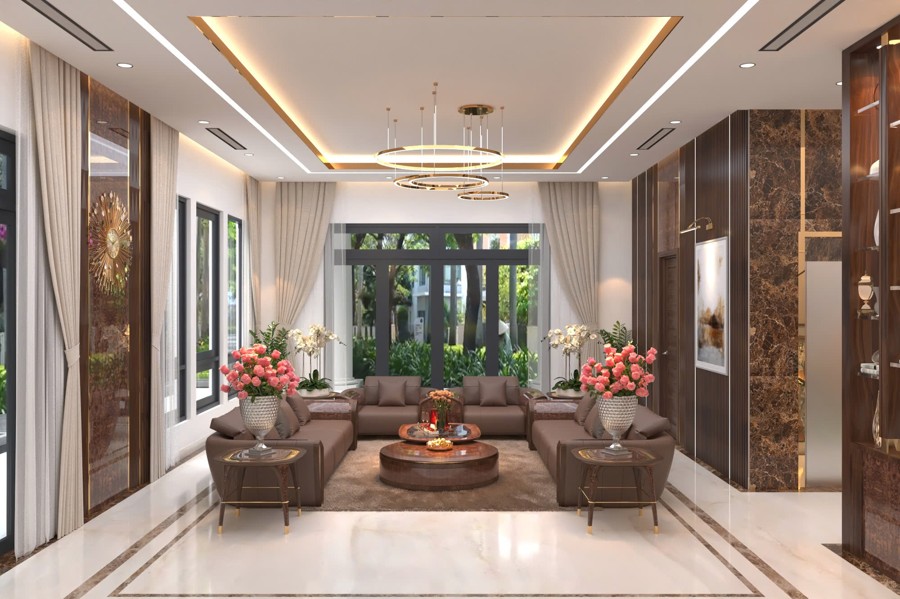 Không gian sảnh chính tạo cảm giác mở rộng và đón tiếp nồng hậu, là nơi kết nối hoàn hảo giữa bên ngoài và phần nội thất bên trong. Thiết kế chi tiết này góp phần tạo ấn tượng mạnh mẽ cho khách đến chơi, đồng thời khẳng định gu thẩm mỹ cũng như sự chăm chút kỹ lưỡng trong từng đường nét của chủ đầu tư.