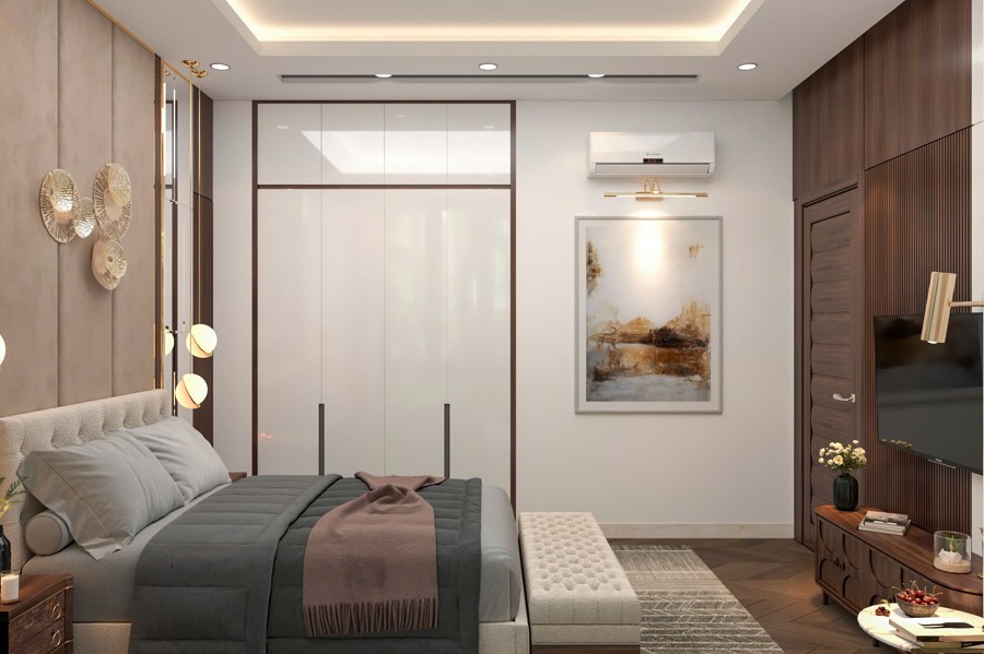 Cửa chính được chế tác bằng gỗ tự nhiên cao cấp, không chỉ tăng tính thẩm mỹ mà còn đảm bảo độ bền và sự chắc chắn cho phần ngoại thất quan trọng nhất ngôi nhà. Sắc gỗ ấm áp tương phản nhẹ nhàng với tông trắng của tường, tạo điểm nhấn đầy cuốn hút và thể hiện chất sang trọng truyền thống.
