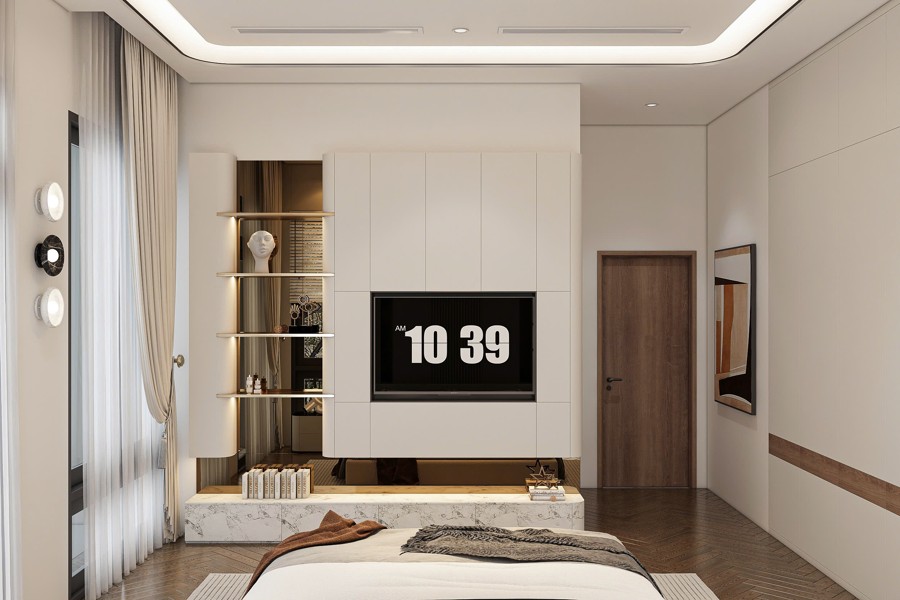 Tông màu trắng sứ còn giúp đón sáng tối ưu, tạo cảm giác không gian rộng rãi và thoáng đãng hơn ngay cả khi ngôi nhà nằm ở những khu đất có diện tích hạn chế. Bên cạnh đó, màu trắng còn dễ dàng phối hợp với các chất liệu và màu sắc khác như màu xanh ghi của mái hay màu nâu cafe của khung cửa, tạo nên sự hài hòa và đồng bộ cho toàn bộ công trình.