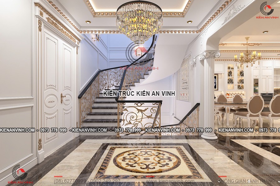 Bên cạnh đó, lan can mạ vàng vừa đáp ứng yêu cầu thẩm mỹ cao cấp, vừa có độ bền vượt trội, giúp bảo vệ an toàn cho người sử dụng. Màu vàng óng ánh nổi bật trên nền trắng kem chủ đạo như một điểm nhấn hoàn hảo, tăng thêm phần giá trị cho kiến trúc biệt thự.