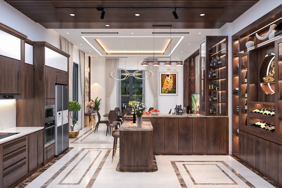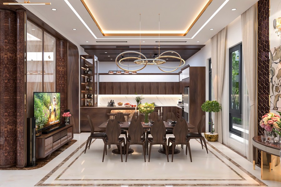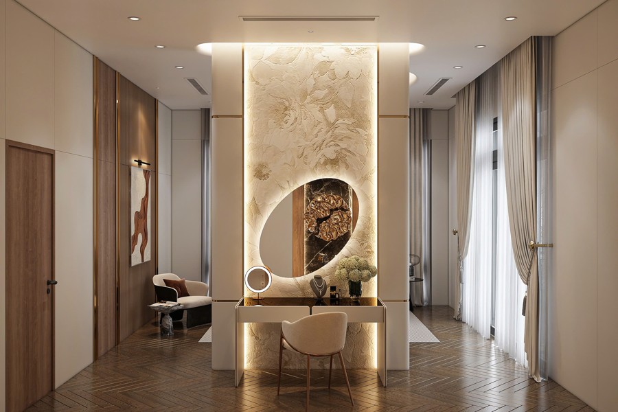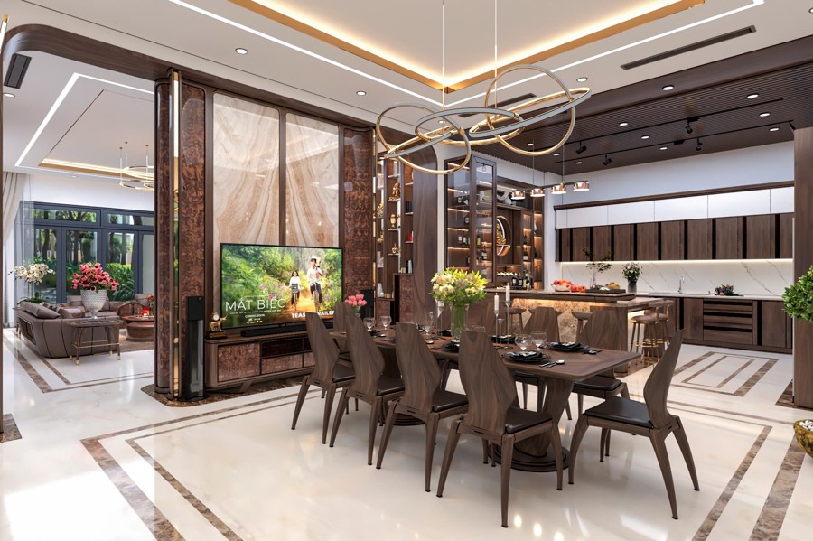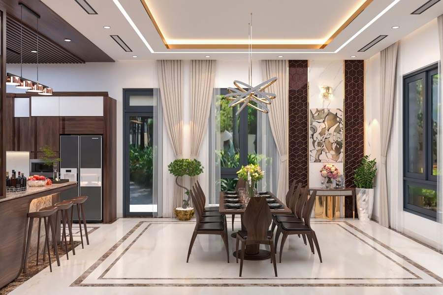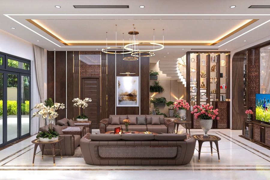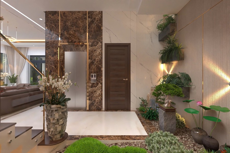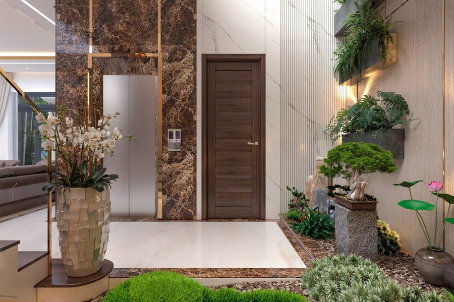 Không gian sảnh chính tạo cảm giác mở rộng và đón tiếp nồng hậu, là nơi kết nối hoàn hảo giữa bên ngoài và phần nội thất bên trong. Thiết kế chi tiết này góp phần tạo ấn tượng mạnh mẽ cho khách đến chơi, đồng thời khẳng định gu thẩm mỹ cũng như sự chăm chút kỹ lưỡng trong từng đường nét của chủ đầu tư.