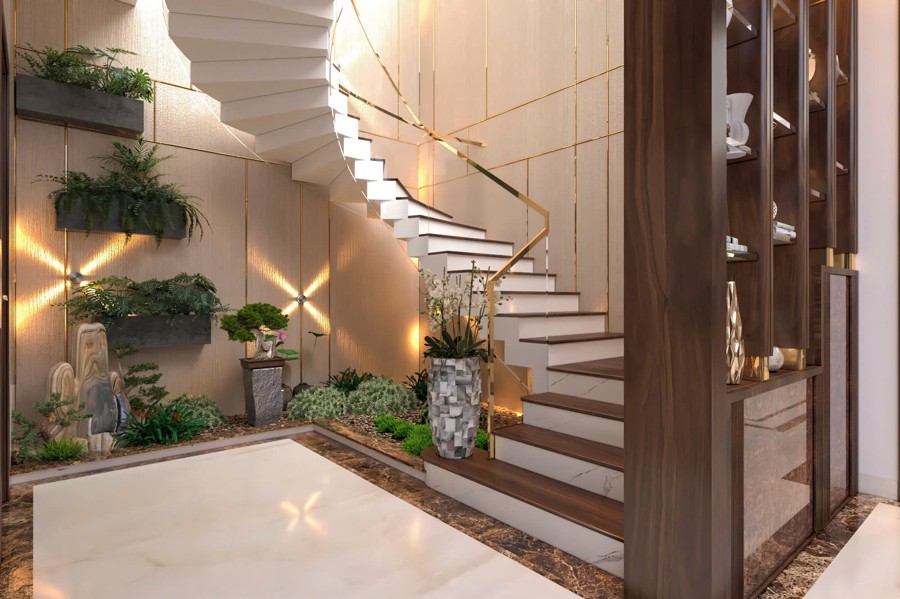 Ngoài ra, các khoảng trống ở ban công và chân tường được tận dụng bố trí cây cảnh, tiểu cảnh xanh mướt giúp mang lại không khí trong lành và cảm giác gần gũi với thiên nhiên. Yếu tố xanh này không chỉ làm dịu mắt mà còn cải thiện chất lượng cuộc sống, đồng thời góp phần tạo nên sự cân bằng sinh thái và sự thư giãn cho mọi thành viên trong gia đình.
