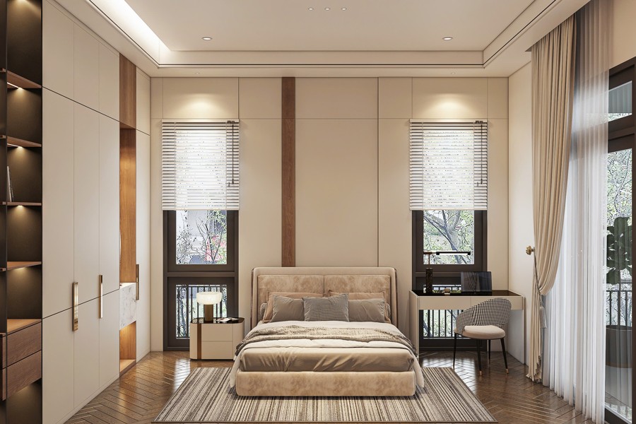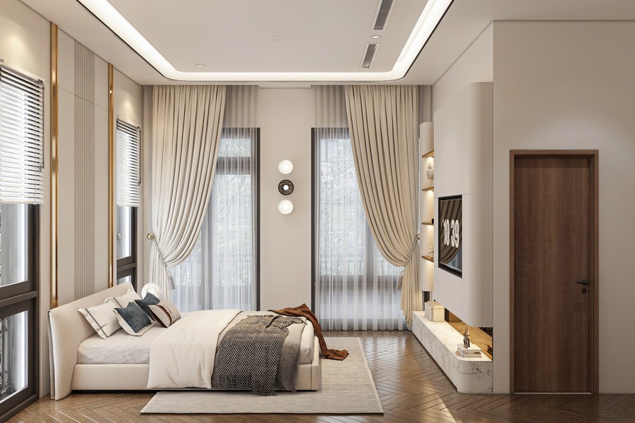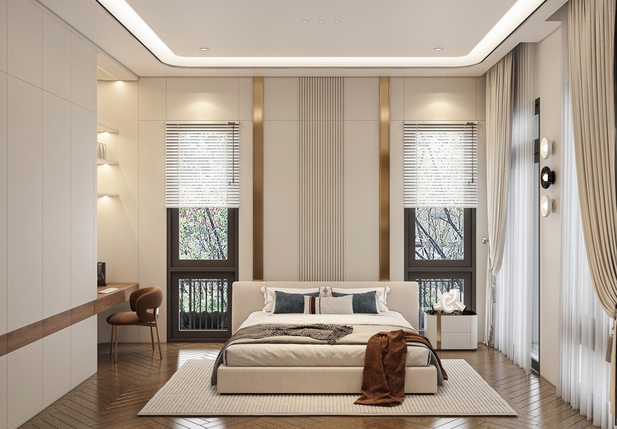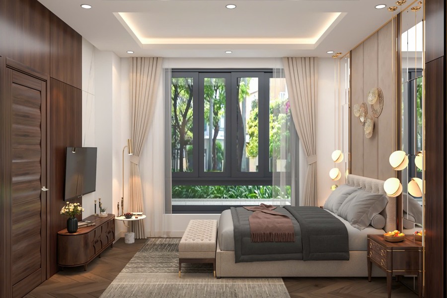 Hệ thống cửa sổ sử dụng nhôm kính màu nâu cafe kết hợp với cửa kính lớn giúp tận dụng tối đa ánh sáng tự nhiên, góp phần mở rộng tầm nhìn và tạo sự thoáng đãng cho không gian nội thất. Thiết kế này mang lại cảm giác gần gũi với môi trường bên ngoài, đồng thời cũng tăng cường hiệu quả cách âm và cách nhiệt cho biệt thự tân cổ điển 3 tầng.
